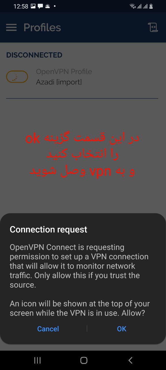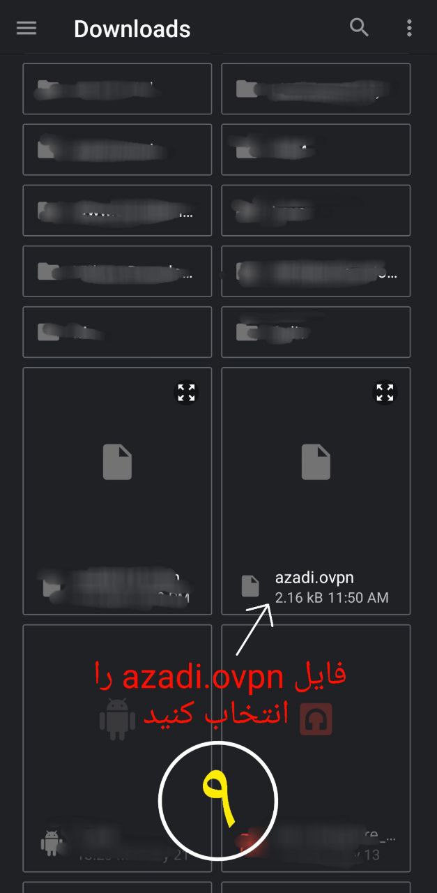 کافیست روی دکمه دانلود زیر کلیک نمایید تا فایل دانلود و با نام azadi.ovpn در گوشی ذخیره شود.